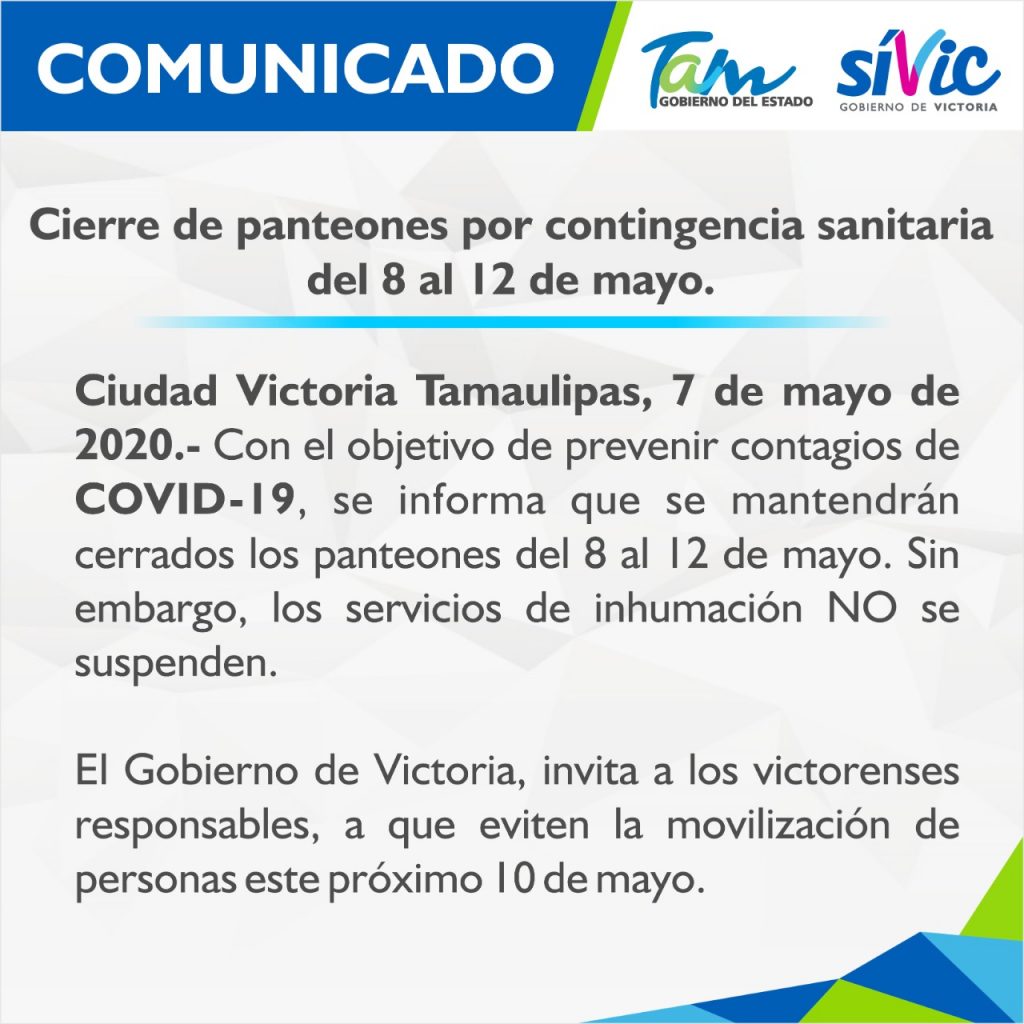 Ciudad Victoria Tamaulipas, 7 de mayo de 2020.- Con el objetivo de prevenir contagios de COVID-19, se informa que se mantendrán cerrados los panteones del 8 al 12 de mayo. Sin embargo, los servicios de inhumación NO se suspenden.