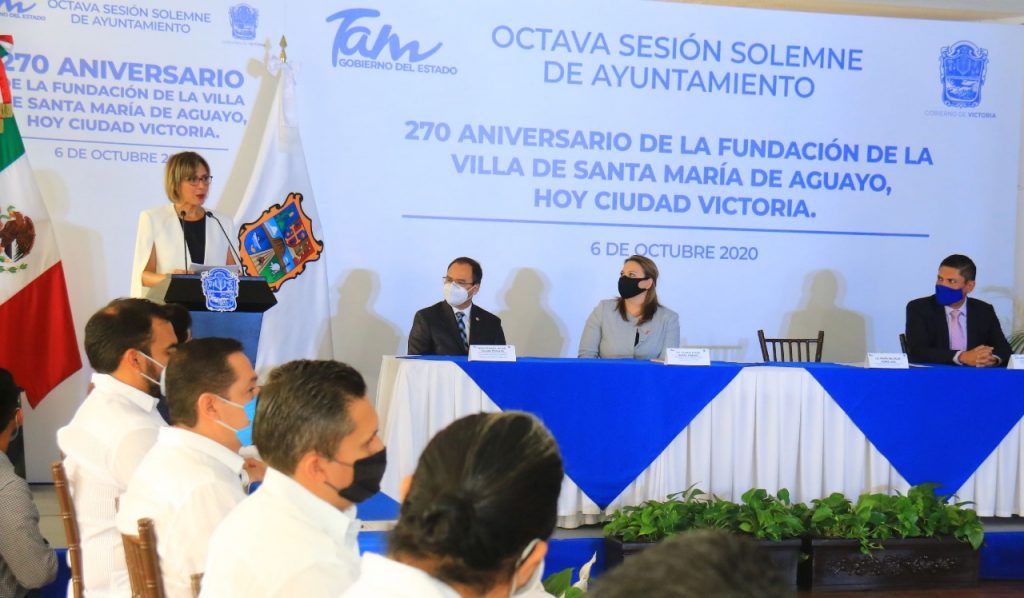 Ciudad Victoria, Tamaulipas (6 de octubre de 2020).- Este martes 6 de octubre, Victoria celebra 270 años de la fundación de Villa de Aguayo, hoy Ciudad Victoria realizando la Octava Sesión Solemne del Ayuntamiento en la plaza Hidalgo la cual recibió a las autoridades del cabildo así como representantes del poder ejecutivo y legislativo.