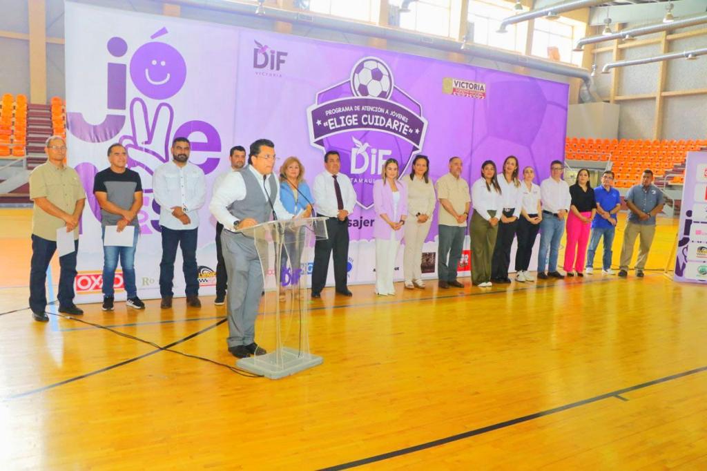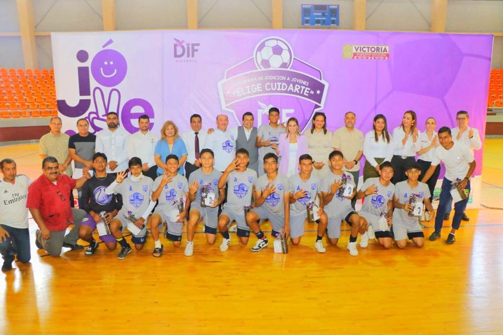 Cd. Victoria, Tamps., 5 de junio. – En un ambiente de fiesta deportiva, el alcalde Eduardo Gattás Báez y la Sra. Lucy de Gattás encabezaron la clausura y premiación del torneo de fútbol 7 “Elige Cuidarte” organizado por el DIF Victoria bajo la coordinación del Sistema DIF Tamaulipas.