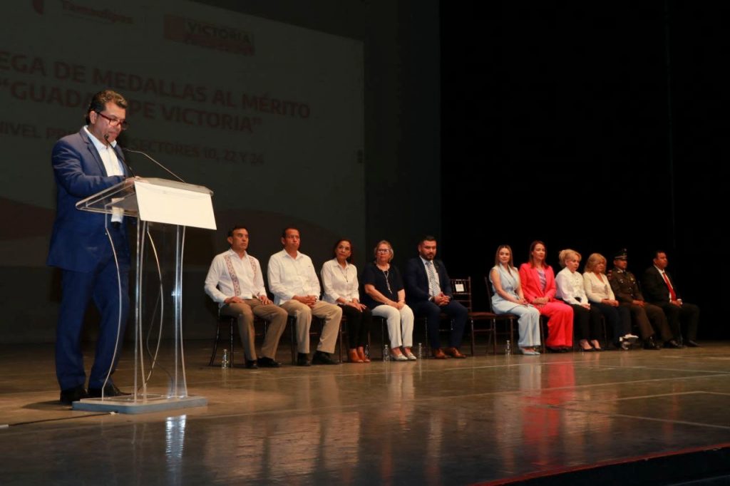 El representante del Gobernador Américo Villarreal Anaya, el coordinador general de Desarrollo Intergubernamental Ing. Carlos Orozco Morales destacó que las medallas que otorga el Gobierno de Victoria reconocen abiertamente el empeño, talento y dedicación al estudio de alumnos y maestros.