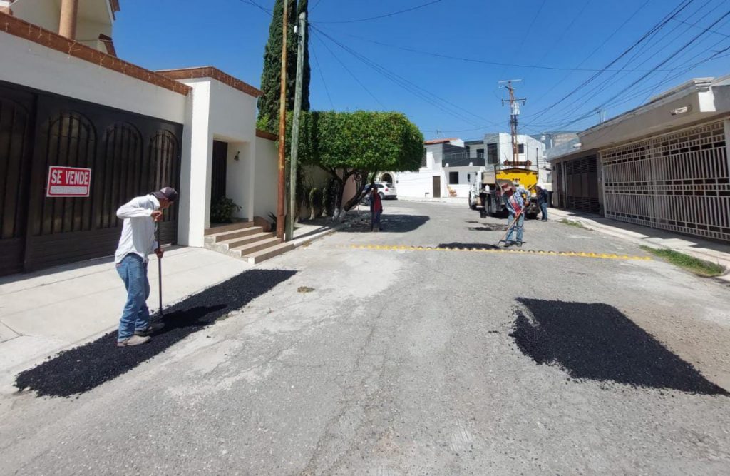 Esta semana, brigadas del municipio dieron continuidad a los trabajos de reparación de carpeta asfáltica en el 27 y 28 Servando Canales de la colonia Caminera y calles del sector Los Cristales y Haciendas del Santuario.