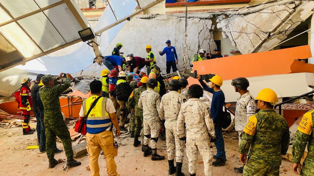 El alcalde Eduardo Gattás Báez y el secretario general de Gobierno Héctor Villegas González encabezaron las tareas de rescate, a las que se sumaron elementos de la SEDENA, Guardia Nacional, Guardia Estatal y Cruz Roja con el retiro de escombros de las áreas donde quedaron atrapadas las tres personas que laboraban en el plantel al momento del colapso.