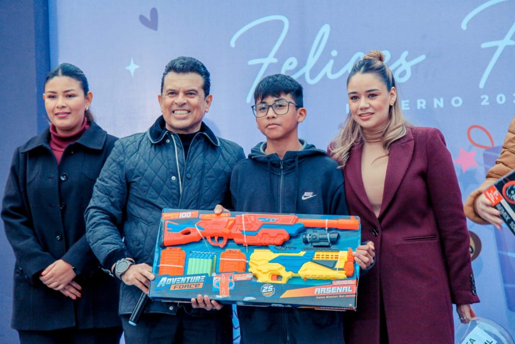 Posteriormente, la Presidenta y el alcalde dieron la bienvenida a los cerca de 800 asistentes, deseándoles a todos una muy feliz navidad, agradeciendo su presencia al festejo que fue preparado por todo el equipo DIF con mucho cariño. Así mismo, al término del mensaje, la Presidenta y el alcalde iniciaron con la entrega de premios, donde el primer juguete en ser entregado fueron pelotas, que eran lanzadas hacia el público y que las niñas y niños recibían con gran emoción.