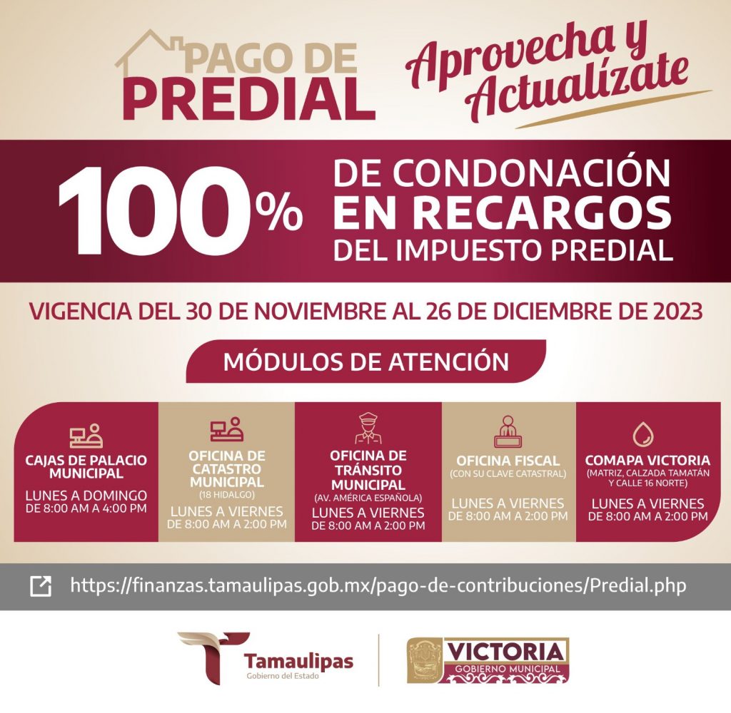 Cd. Victoria, Tamps., 29 de noviembre. – En beneficio de la economía familiar y para fortalecer la hacienda pública municipal, el Cabildo de Victoria aprobó con voto unánime la condonación del 100% de recargos del impuesto predial sobre la propiedad urbana, suburbana y rústica. La propuesta remitida por el presidente municipal de Victoria Eduardo Gattás