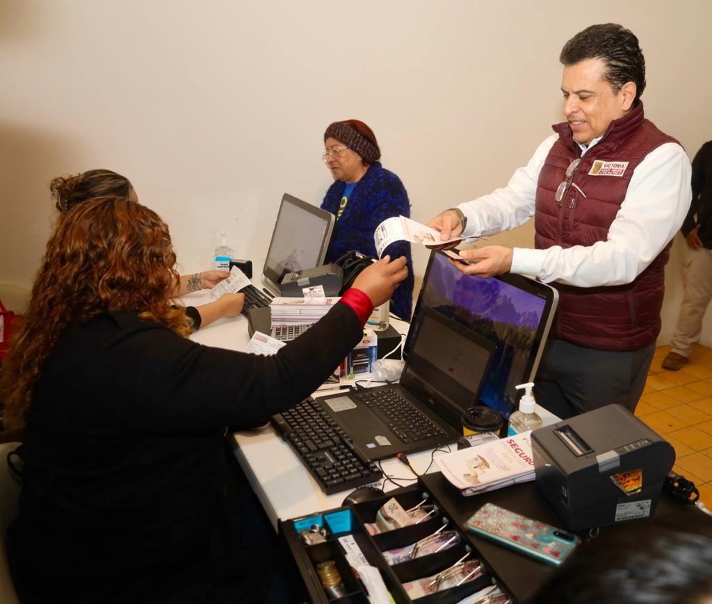 Cd. Victoria, Tamps., 2 de enero de 2024.- El presidente municipal de Victoria Eduardo Gattás Báez, en compañía de secretarios del Ayuntamiento, acudió este día a pagar su impuesto predial y dar arranque oficial al programa de recaudación de 2024 con el exhorto a la ciudadanía de aprovechar los descuentos que se otorgan en el mes de enero por el cumplimiento de esta contribución.