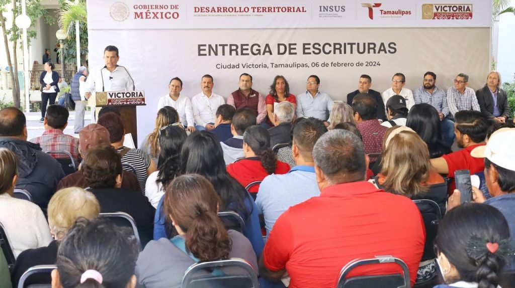 Cd. Victoria, Tamps., 7 de febrero 2024. – En un acto de justicia social el alcalde Eduardo Gattás Báez presidió con autoridades estatales y federales la entrega de escrituras de propiedad a familias victorenses de las colonias El Paraíso, Santa Clara, 7 de Noviembre, La Montaña y La Presa I y II.