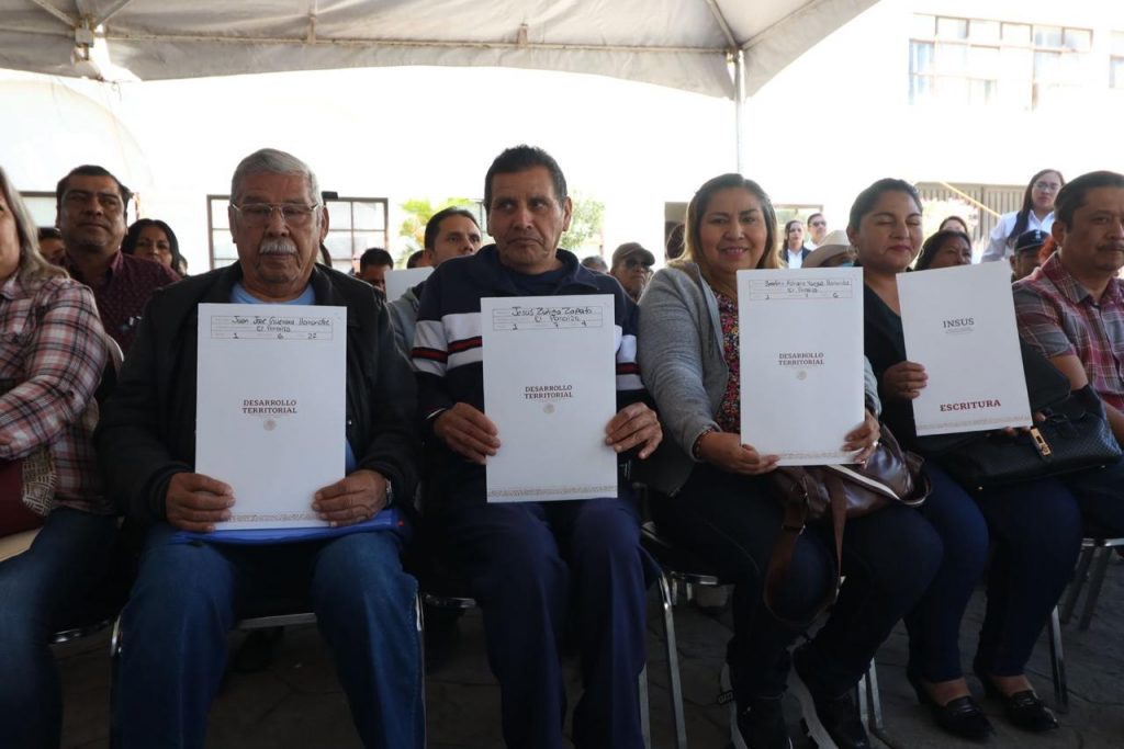 Un total de 110 familias recibieron el documento jurídico avalado por el Director General del Instituto Registral y Catastral del Estado Armando de la Cruz Alcántar y del representante regional del Instituto Nacional de Suelo Sustentable Yeraldo Emanuel Torres Flores.