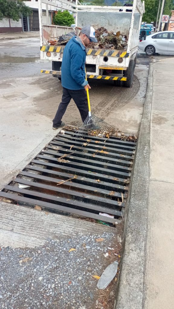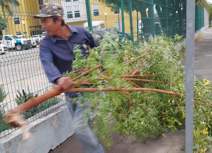 Cuadrillas de trabajadores recorren distintos sectores para restaurar el daño ocasionado por el paso del frente frío número 42 que, con fuertes ráfagas de viento e intensa lluvia, ocasionó la noche de este jueves inundaciones mínimas en algunas vialidades.