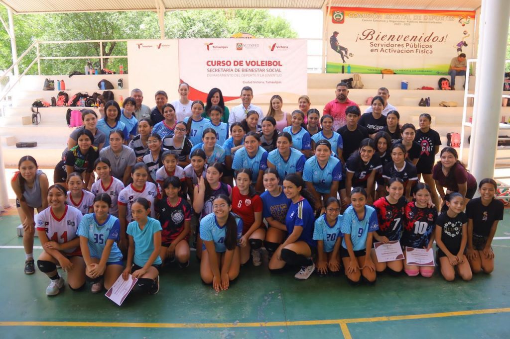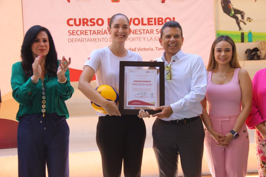 En compañía de Lucy de Gattás y la secretaria general del SUTSPET Blanca Valles, hizo lo propio con la seleccionada nacional de México y jugadora profesional en Portugal Ceci Ríos, quién impartió curso de voleibol a niñas y jóvenes de ligas locales con el propósito de impulsar la disciplina y práctica del deporte.