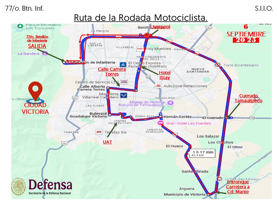 Cd. Victoria, 5 de septiembre 2025. – La Secretaría de la Defensa Nacional, a través del 77 Batallón de Infantería, en coordinación con la Presidencia Municipal de Victoria anunció la Tercera Rodada Motociclista 2025 “Los Soldados También Somos Tamaulipas” para este sábado 6 de septiembre.