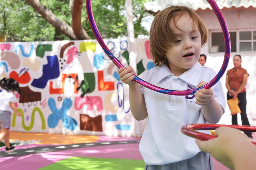 Cabe destacar que el tartán, material con el que fue construido el piso del área de juegos, es una superficie antideslizante y de alta resistencia que amortigua caídas y protege a las niñas y niños mientras se divierten, ofreciendo mayor seguridad durante sus actividades recreativas.