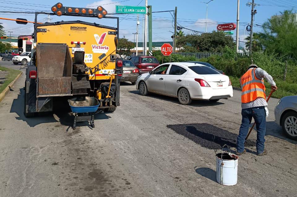 Cuadrillas de Obras Públicas y empresas locales, trabajan a marcha forzada para restaurar calles dañadas por las recientes lluvias, dando cumplimiento a la instrucción del alcalde de Victoria Eduardo Gattás Báez para cambiar el rostro vial a la Capital y Corazón de Tamaulipas.