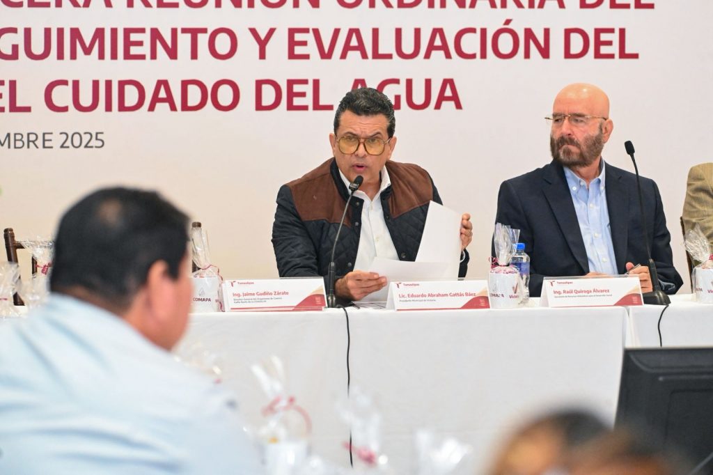 Cd. Victoria, 5 de diciembre 2025. – El alcalde de Victoria Eduardo Gattás Báez presidió, junto al secretario de Recursos Hidráulicos para el Desarrollo Social del gobierno del Estado, Raúl Quiroga Álvarez, la vigésima tercera reunión ordinaria del Comité de Seguimiento y Evaluación del Semáforo del Cuidado del Agua.