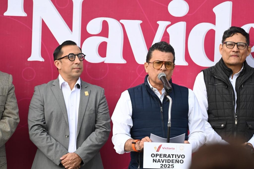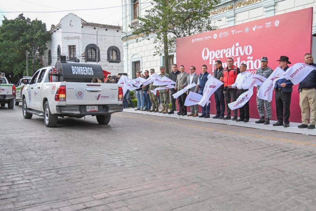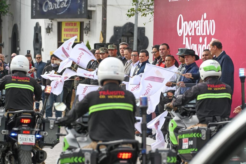 Cd. Victoria, 8 de diciembre 2025. – Con 350 elementos policíacos, de protección y auxilio, el alcalde de Victoria Eduardo Gattás Báez dio el banderazo al operativo navideño 2025, para reforzar la seguridad de residentes y visitantes a la Capital durante la época decembrina.