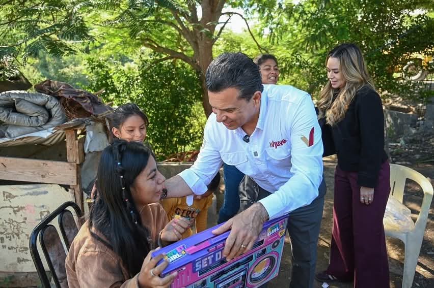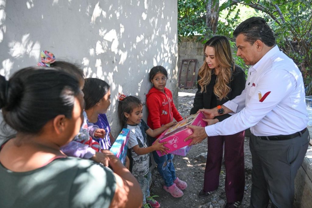 Cd. Victoria, 23 de diciembre 2025. – Cómo parte de la campaña «Ayudemos a Santa 2025» el alcalde de Victoria Lalo Gattás y su esposa Lucy de Gattás, presidenta del Sistema DIF Municipal, recorrieron hogares de las colonias Rosalinda Guerrero y Constitución del 17 para obsequiar juguetes y convivir con familias previo al festejo de la navidad.