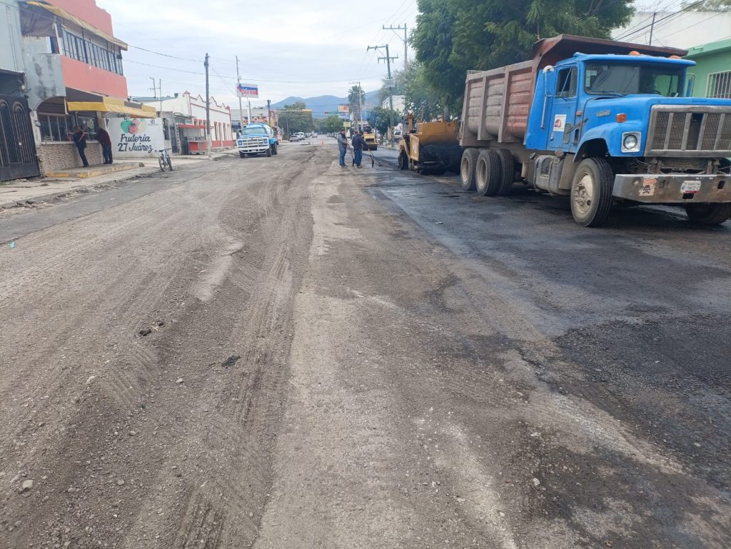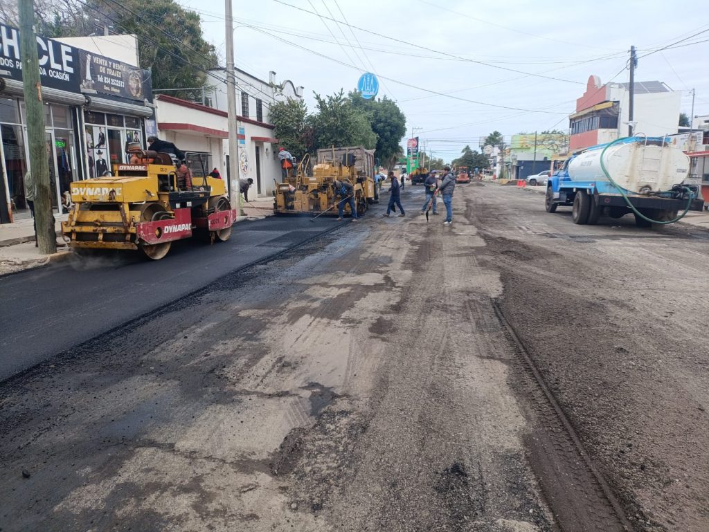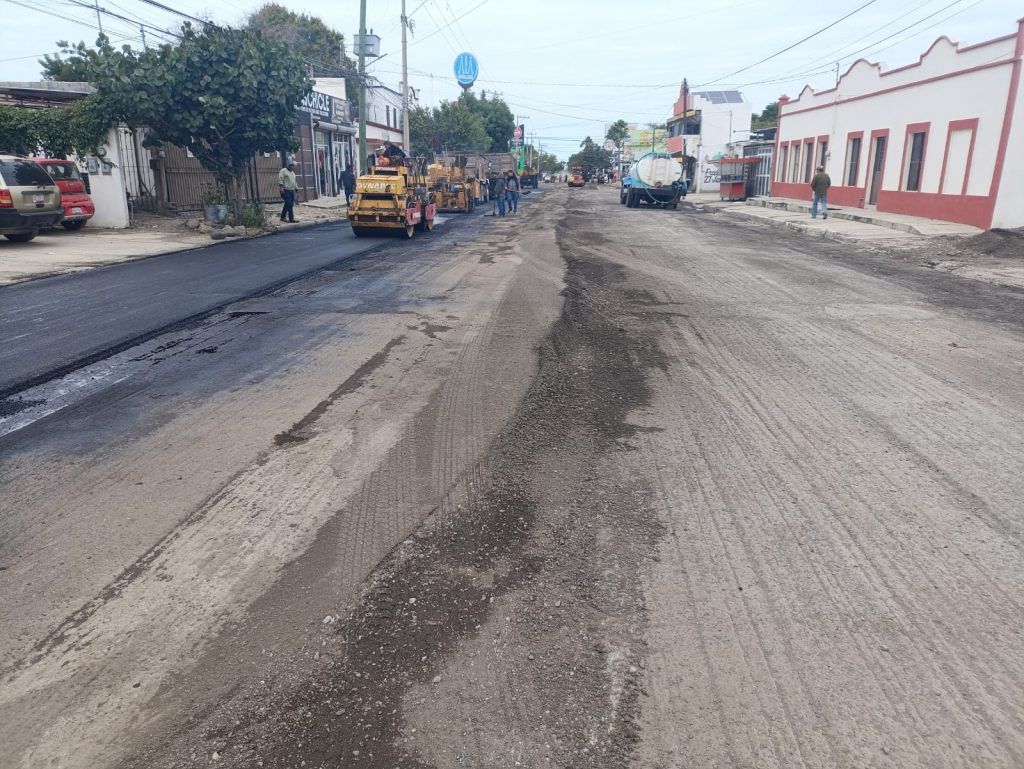 Tras la restitución de 900 metros de red central y tomas domiciliarias de agua potable por parte de COMAPA y nivelación de superficie, cuadrillas de la secretaría de Obras Públicas del Municipio iniciaron la aplicación de nueva carpeta asfáltica en los 12,743 metros cuadrados proyectados a restituir.