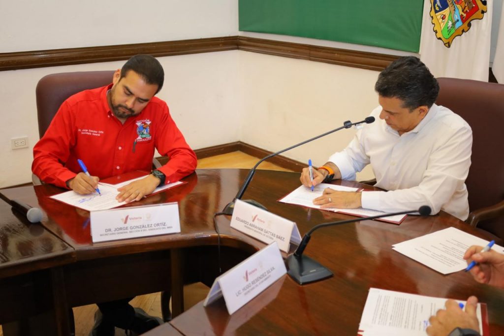 Cd. Victoria, 6 de febrero de 2026. – Como parte de la estrategia de facilitar el pago de impuestos, derechos y contribuciones municipales, el gobierno de Victoria firmó convenio de colaboración con la Sección X del Sindicato del Instituto Mexicano del Seguro Social.