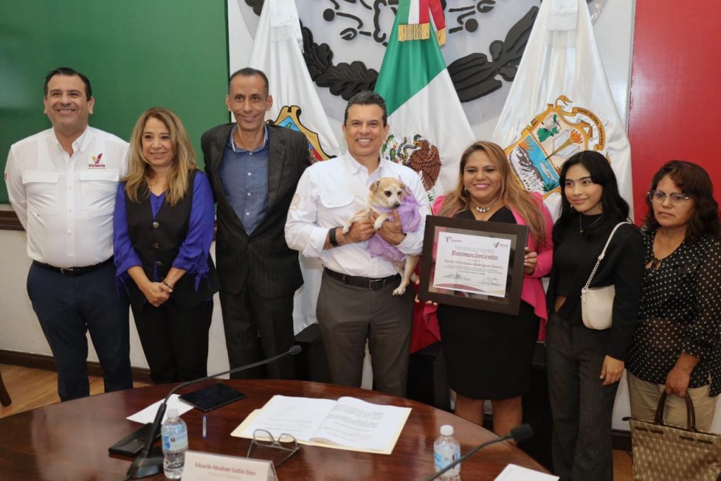 Más conocida como Mia Fressy, la ciudadana victorense acudió a la quincuagésima séptima sesión pública a invitación de la regidora Carmen Serna Mercado para recibir el merecido reconocimiento que el otorga el cabildo de Victoria por su gran labor de respeto y bienestar hacia los animales.